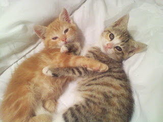 But even before that, in March of last year, our landlord approached us and told us they wanted to sell the house we were living in. So Hubby and I took the plunge and we bought our first house. A one story, three bedroom, two bathroom little house in a cul-de-sac with a huge fenced in back yard for our dog to play. You remember Bowen, don't you? We thought about getting another dog when we moved in for him to play with but then we were given a whole new task. Two little baby kittens showed up at a co-workers house and needed a home. I was just going to take one, until I convinced Hubby that separating them was just cruel. And so, we took them both.
